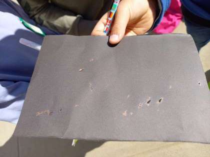 日光を集めたとき(3年理科) (11月29日) 公開日 2021/11/29 更新日 2021/11/29 お知らせ 3年生は理科の時間に、「光のせいしつ」について学習していますが、虫めがねを使って黒い紙に日光を集めると日光を集めるとどのようになるか、実験をしました。 今日は日中、日差しも十分にあったため、実験をするにはいいコンディションの日となりました。 日光を集めたところを小さくしていくと、黒い紙から煙が出てきて、穴があきました。 いいね(0)