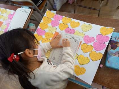 これまでの活動で、お話を読んで1人1人の大切さについて考え、クラス1人1人の「よいところ」を“ハート”型の紙に書いていき、クラス全員から自分の「よいところ」が書かれた“ハート”の紙を受け取り、画用紙いっぱいに貼りつけてきました。