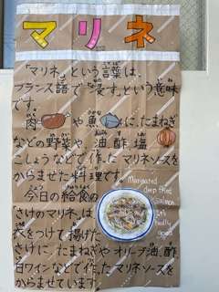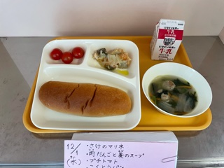 12月1日(水)、今日の給食は「さけのマリネ・肉だんごと麦のスープ・プチトマト・黒糖パン・牛乳」です。
