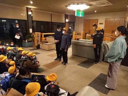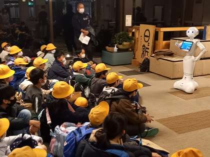 今晩のお宿、「みち潮」に到着です。 開舎式では「ペッパーくん」が登場です。