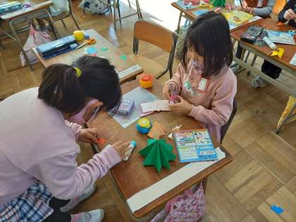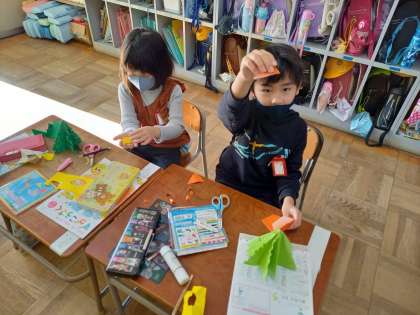 2組では「おって きって たてよう」をテーマに、「折る」「切る」「立てる」の3要素を取り入れた作品を考えて、子どもたちは制作を行っています。