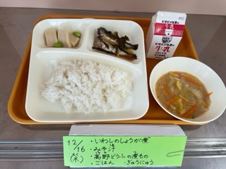 12月16日(木)、今日の給食は「いわしのしょうが煮・みそ汁・高野どうふの煮もの・ごはん・牛乳」です。