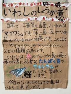 いわしのしょうが煮は、小ぶりのいわしがひとり2尾ずつつきました。オーブンで煮ましたが、骨まで柔らかく煮えていました。魚が苦手な子どもや、魚を食べ慣れていない子どもは食べるのに苦労していましたが、魚はぜひとも食べてほしい食品です。