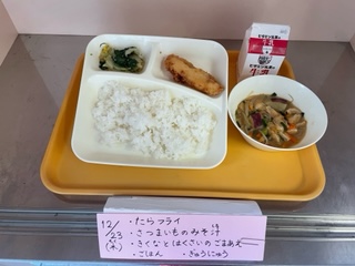 12月23日(木)、今日の給食は「たらフライ・さつまいものみそ汁・きくなとはくさいのごまあえ・ごはん・牛乳」です。