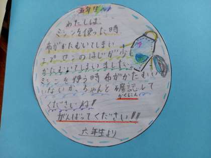 そこで、ミシンの“先輩”でもある6年生が、5年生にむけて、あたたかいメッセージとアドバイスを書いていました!