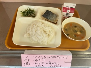 1月28日(金)の給食は、「さごしのしょうゆだれかけ・みそ汁・みずなの煮びたし・ごはん・牛乳」です。