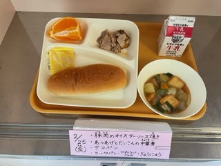 2月25日(金)、今日の給食は「豚肉のオイスターソース焼き・あつあげとだいこんの中華煮・デコポン・コッペパン・アプリコットジャム・牛乳」です。