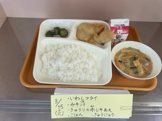 3月15日(火)、今日の給食は「いわしフライ・みそ汁・きゅうりの赤じそあえ・ごはん・牛乳」です。