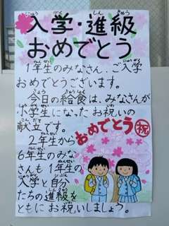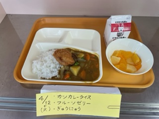 4月12日(火)、今日の給食は入学お祝い献立で「カツカレーライス・フルーツゼリー・牛乳」です。
