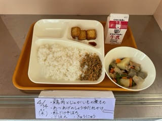 4月1日(木)、今日の給食は「鶏肉とじゃがいもの煮もの・あつあげのしょうゆだれかけ・紅ざけそぼろ・ごはん・牛乳」です。