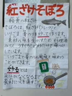 そぼろは、ひき肉、魚、卵などの食材を炒るなどして火を通して、細かくほぐしたものです。今日は、紅ざけフレークを使った紅ざけそぼろです。骨がなく食べやすいので、魚の苦手な児童にも人気の一品です。