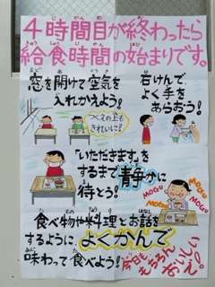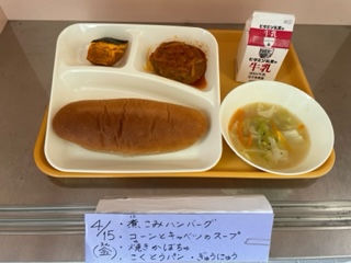 4月15日(金)、今日の給食は「煮こみハンバーグ・コーンとキャベツのスープ・焼きかぼちゃ・黒糖パン・牛乳」です。