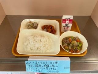 4月18日(月)、今日の給食は「まぐろのオーロラ煮・豚肉と野菜の煮もの・キャベツの赤じそあえ・ごはん・牛乳」です。