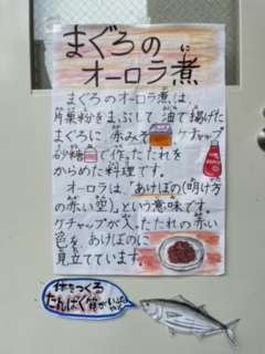 まぐろのオーロラ煮は、ケチャップ味で子どもたちにとても人気のある献立です。骨がなく、魚のくさみも気にならないので(しょうが汁と料理酒で下味をつけています)、魚が苦手な子どもにも食べやすいです。