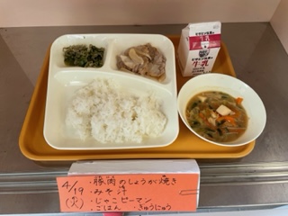 4月19日(火)、今日の給食は「豚肉のしょうが焼き・みそ汁・じゃこピーマン・ごはん・牛乳」です。