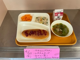 4月20日(水)、今日の給食は「マカロニグラタン・レタスのスープ・みかん(缶)・コッペパン・いちごジャム・牛乳」です。