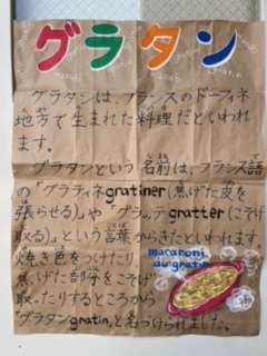 手作りのグラタンは、各クラス毎に深めのバットに入れ、オーブンで焼き上げています。パン粉と粉末チーズを合わせたものを、振りかけて焼いているので、表面の焦げまでおいしいグラタンです。