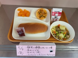 5月9日(月)、今日の給食は「豚肉と野菜のカレースープ煮・変わりピザ・みかん(缶)・コッペパン・いちごジャム・牛乳」です。