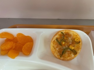 変わりピザは、ツナ缶、コーン、ピーマン、ピザソース、細切りチーズを混ぜ合わせた具をギョーザの皮にのせて、オーブンで焼いています。子どもたちにとても人気のある献立です。