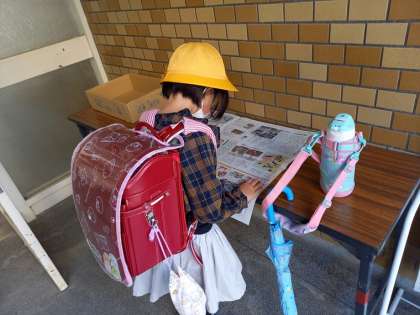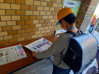 波除小学校では、この連休明けから一般紙と子ども新聞の2種類の新聞を玄関脇に置いています。