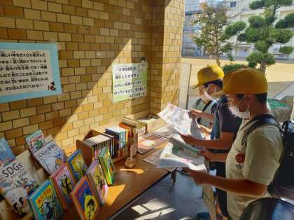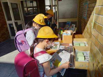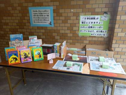 子どもたちが登下校で通る玄関横に「新聞」と「おすすめの本」のコーナーを設置しています。