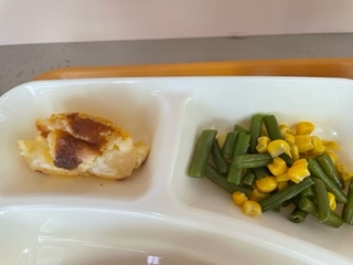 5月25日(水)、今日の給食は「ケチャップ煮・三度豆とコーンのソテー・りんごのクラフティ・黒糖パン・牛乳」です。