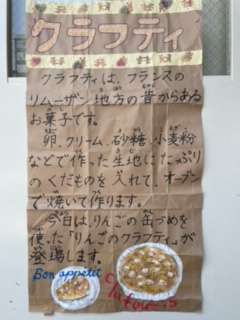 クラフティは、タルト生地の上に果物をのせ小麦粉や鶏卵、クリーム、砂糖などで作った生地を流し入れ、オーブンで焼き上げるのですが、給食では、タルト生地の代用として、コーンフレークを使っています。カスタードのような味と果物のさっぱりとした味がとても相性のよいデザートです。