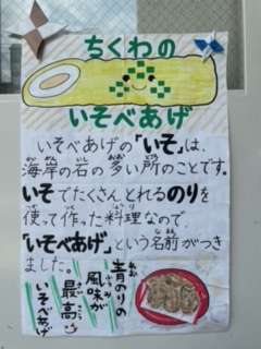 5月31日(火)、今日の給食は「ちくわのいそべあげ・あつあげとさといものみそ煮・あっさりキャベツ・ごはん・牛乳」です。