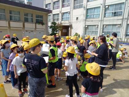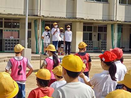 先週、たてわり班の「ナミーゴ班」が編成され、今日から毎週水曜日の朝の時間は、運動場で児童集会が行われます。