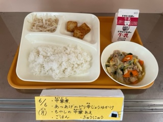 6月6日(月)、今日の給食は「中華煮・あつあげのピリ辛じょうゆかけ・もやしの中華あえ・ごはん・牛乳」です。