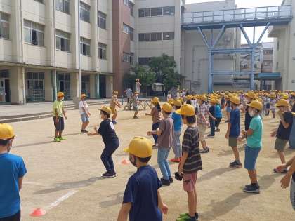 今日の全校朝会は子どもたちと先生全員で「ラジオ体操」をしました。