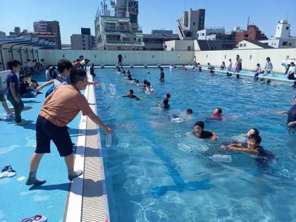 子どもたちは実際に服を着たままプールに入り、水を含んだ服の重さというものを実感しました。