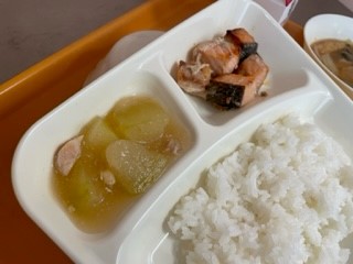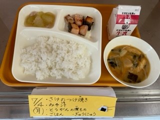 7月4日(月)、今日の給食は「さけのつけ焼き・みそ汁・とうがんの煮もの・ごはん・牛乳」です。