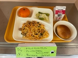 7月7日(木)、今日の給食は「チキントマトスパゲッティ・グリーンアスパラガスとキャベツのサラダ・冷凍みかん・黒糖ロールパン・牛乳」です。
