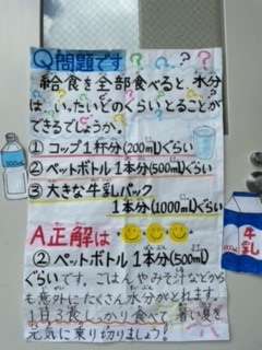 今日は「食事からとる水分量」についてふれました。日本人の大人ひとりが1日にとる水の量は、1日2.2リットルだそうです。そのうち食事からは、1.1リットルほどだそうです。食事からも意外にたくさんの水分がとれます。夏バテ予防、熱中症予防のために1日3食、しっかり食べたいものです。