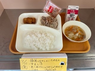 7月12日(月)、今日の給食は「豚肉ともやしのいためもの・すまし汁・あつあげのしょうがじょうゆかけ・ごはん・牛乳」です。