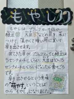 もやしは、成長が早いうえ、通年で栽培できるので、お財布にもやさしい野菜です。炒めてよし、蒸してよしと手軽に使いやすいです。給食では、ブラックマッペもやしを使っています。