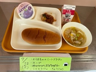 7月12日(火)、今日の給食は「かぼちゃのミートグラタン・スープ・ぶどうゼリー・黒糖パン・牛乳」です。