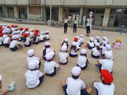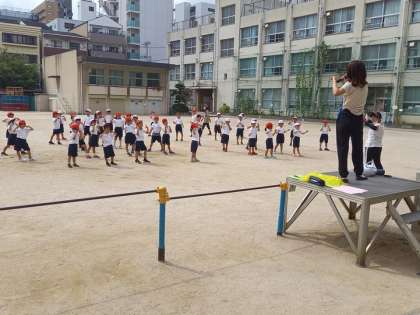 今日は1年生の子どもたちに、先生方から運動会のときに行うダンスについて、紹介がありました。