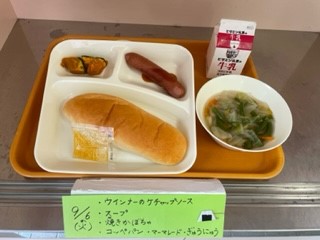 9月6日(火)、今日の給食は「ウインナーのケチャップソース・スープ・焼きかぼちゃ・コッペパン・牛乳」です。