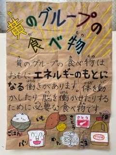 今日は食べ物の働き別のグループの「黄」グループについてふれました。黄のグループは、比較的子どもたちの好きな食べ物が多いです。しっかりとってほしいのですが、とりすぎると摂取エネルギーがオーバーしやすいので、気をつけてほしいです。