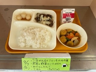 9月7日(水)、今日はお月見の行事献立で「一口がんもとさといものみそ煮・牛肉と野菜のいためもの・みたらしだんご・ごはん・牛乳」です。