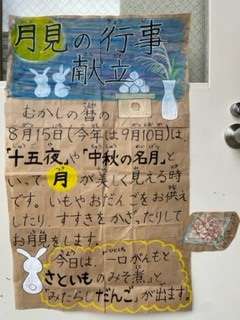 お月見の行事献立として、さといもを使った「一口がんもとさといものみそ煮」、団子を使った「みたらしだんご」が登場しました。