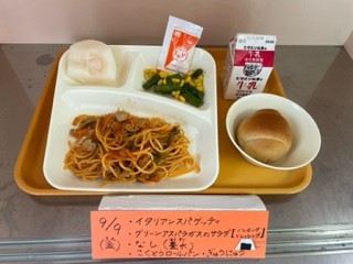 9月9日(金)、今日の給食は「イタリアンスパゲッティ・グリーンアスパラガスのサラダ【ノンエッグドレッシング】・なし(豊水)・黒糖ロール・牛乳」です。