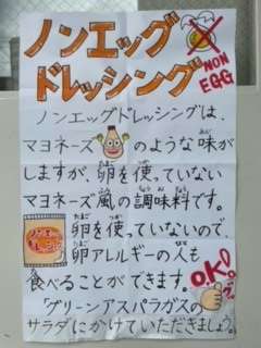 今日のグリーンアスパラガスのサラダは、一人一袋ずつのノンエッグドレッシングドレッシングをかけていただきます。ノンエッグドレッシングは、卵不使用のマヨネーズ風の調味料です。卵アレルギーの児童も安心して食べることができます。