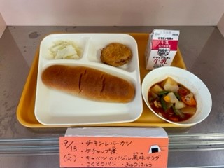 9月13日(火)、今日の給食は「チキンレバーカツ・ケチャップ煮・キャベツのバジル風味サラダ・黒糖パン・牛乳」です。
