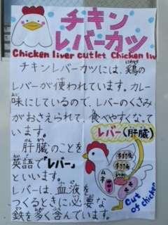 チキンレバーカツは、鶏肉、鶏レバー、たまねぎ、パン粉、でんぷん、砂糖、食塩、香辛料(カレー粉)などを原料に使っています。カレーの風味でレバーの臭みが抑えられ食べやすくなっています。こどもたちにも好評でした!