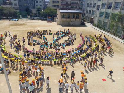 虹と校章をデザインした人文字を運動場に作り、上空からセスナ機で撮影が行われました。