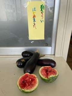今日(9/14)は、2年生が学習園で育てた「なす」と「すいか」を収穫しました。