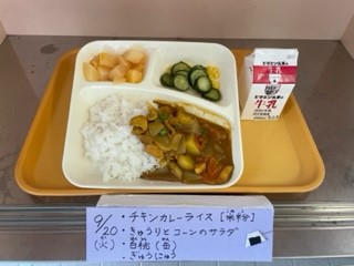 9月20日(火)、今日の給食は「チキンカレーライス【米粉】・きゅうりとコーンのサラダ・白桃(カット缶)・牛乳」です。